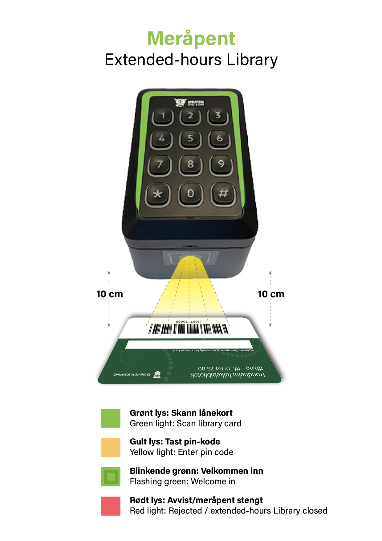 Bydelsbibliotekene Byåsen, Heimdal, Klæbu, Moholt, Ranheim, Risvollan og Saupstad er "meråpne" bibliotek. Det betyr at bibliotekene er tilgjengelige for besøkende utenfor normal åpningstid. Med oppgradert lånekort kan du bruke biblioteket mellom kl 7 og 23 hver dag, hele året, også på dager biblioteket er stengt. Sjekk åpningstidene for endringer i tilbudet.